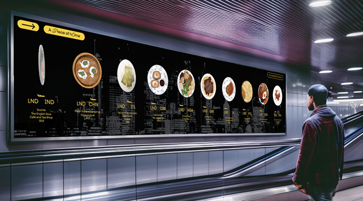 My project Piece of Home (Fig 1.2) reimagines London’s culinary landscape as a reactive map. Living in London has taught me that the traditional British stereotype often conceals the true diversity of life here. To capture this idea, the project uses the metaphor of british food plates flipping to reveal immigrant cuisines, symbolizing how appearances can be deceiving. This flipping action, triggered by the viewer’s movement, mirrors the role of human migration in shaping modern London. Speculative design has allowed me to envision displays that actively engage their environment and audience. I incorporated interactivity, as it is more effective in capturing attention and fostering a personal connection to the stories of immigration and its impact.